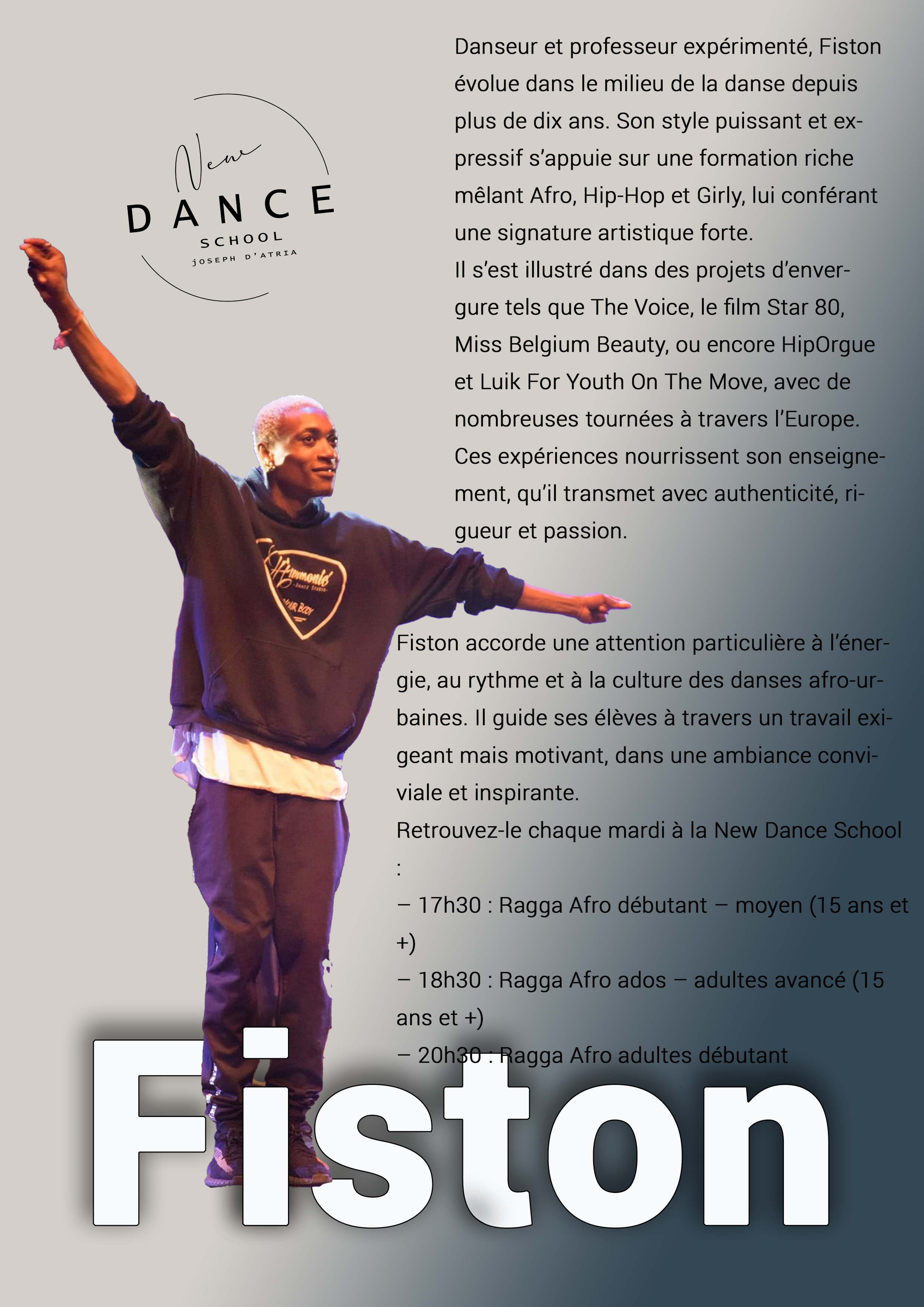 ![]() Danseur et professeur expérimenté, Fiston évolue dans le milieu de la danse depuis plus de dix ans. Son style puissant et expressif s’appuie sur une formation riche mêlant Afro, Hip-Hop et Girly, lui conférant une signature artistique forte. Il s’est illustré dans des projets d’envergure tels que The Voice, le film Star 80, Miss Belgium Beauty, ou encore HipOrgue et Luik For Youth On The Move, avec de nombreuses tournées à travers l’Europe. Ces expériences nourrissent son enseignement, qu’il transmet avec authenticité, rigueur et passion. Fiston accorde une attention particulière à l’énergie, au rythme et à la culture des danses afro-urbaines. Il guide ses élèves à travers un travail exigeant mais motivant, dans une ambiance conviviale et inspirante. Retrouvez-le chaque mardi à la New Dance School : – 17h30 : Ragga Afro débutant – moyen (15 ans et +) – 18h30 : Ragga Afro ados – adultes avancé (15 ans et +) – 20h30 : Ragga Afro adultes débutant |
