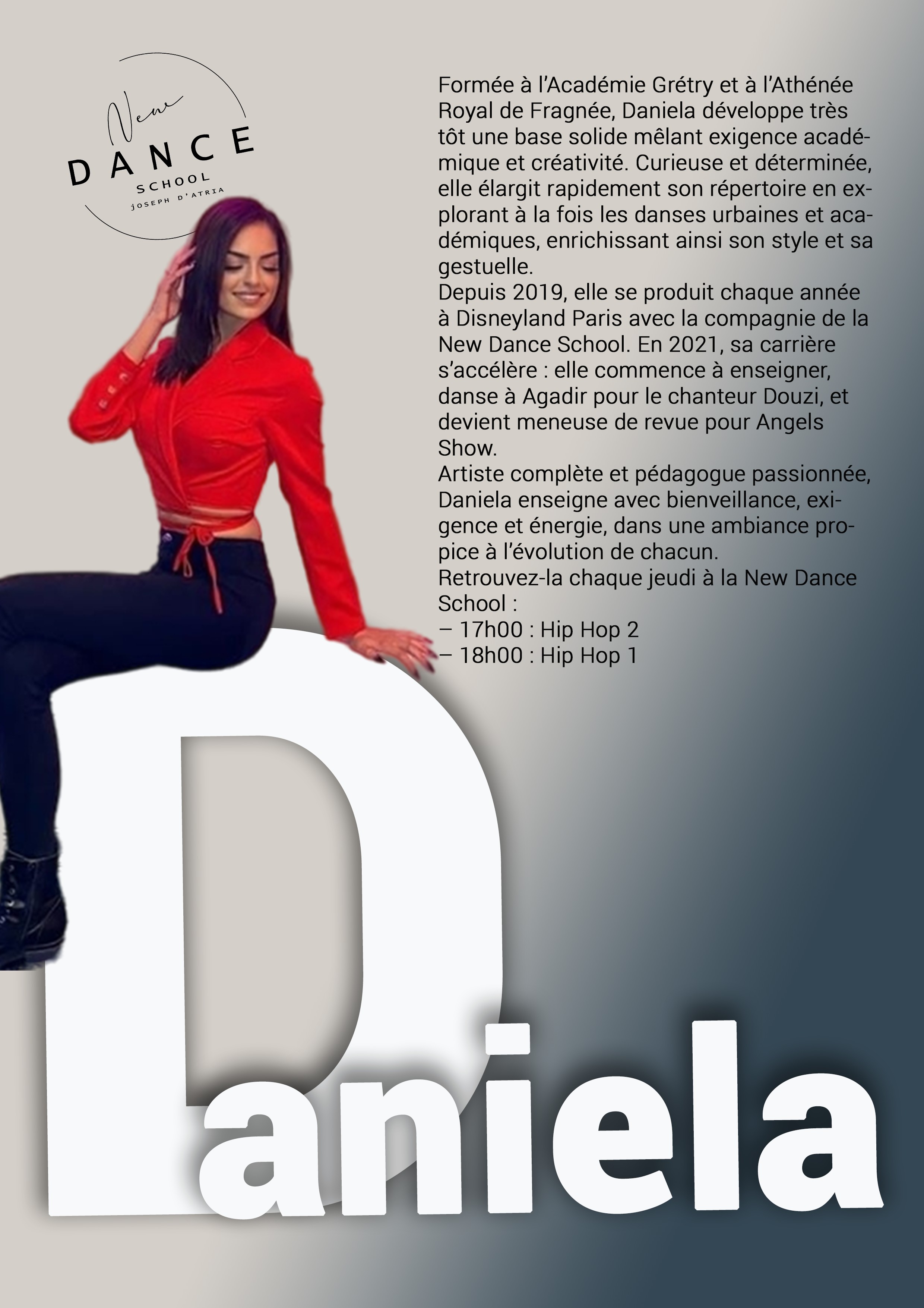 ![]() Formée à l’Académie Grétry et à l’Athénée Royal de Fragnée, Daniela développe très tôt une base solide mêlant exigence académique et créativité. Curieuse et déterminée, elle élargit rapidement son répertoire en explorant à la fois les danses urbaines et académiques, enrichissant ainsi son style et sa gestuelle. Depuis 2019, elle se produit chaque année à Disneyland Paris avec la compagnie de la New Dance School. En 2021, sa carrière s’accélère : elle commence à enseigner, danse à Agadir pour le chanteur Douzi, et devient meneuse de revue pour Angels Show. Artiste complète et pédagogue passionnée, Daniela enseigne avec bienveillance, exigence et énergie, dans une ambiance propice à l’évolution de chacun. Retrouvez-la chaque jeudi à la New Dance School : – 17h00 : Hip Hop 2 – 18h00 : Hip Hop 1 |